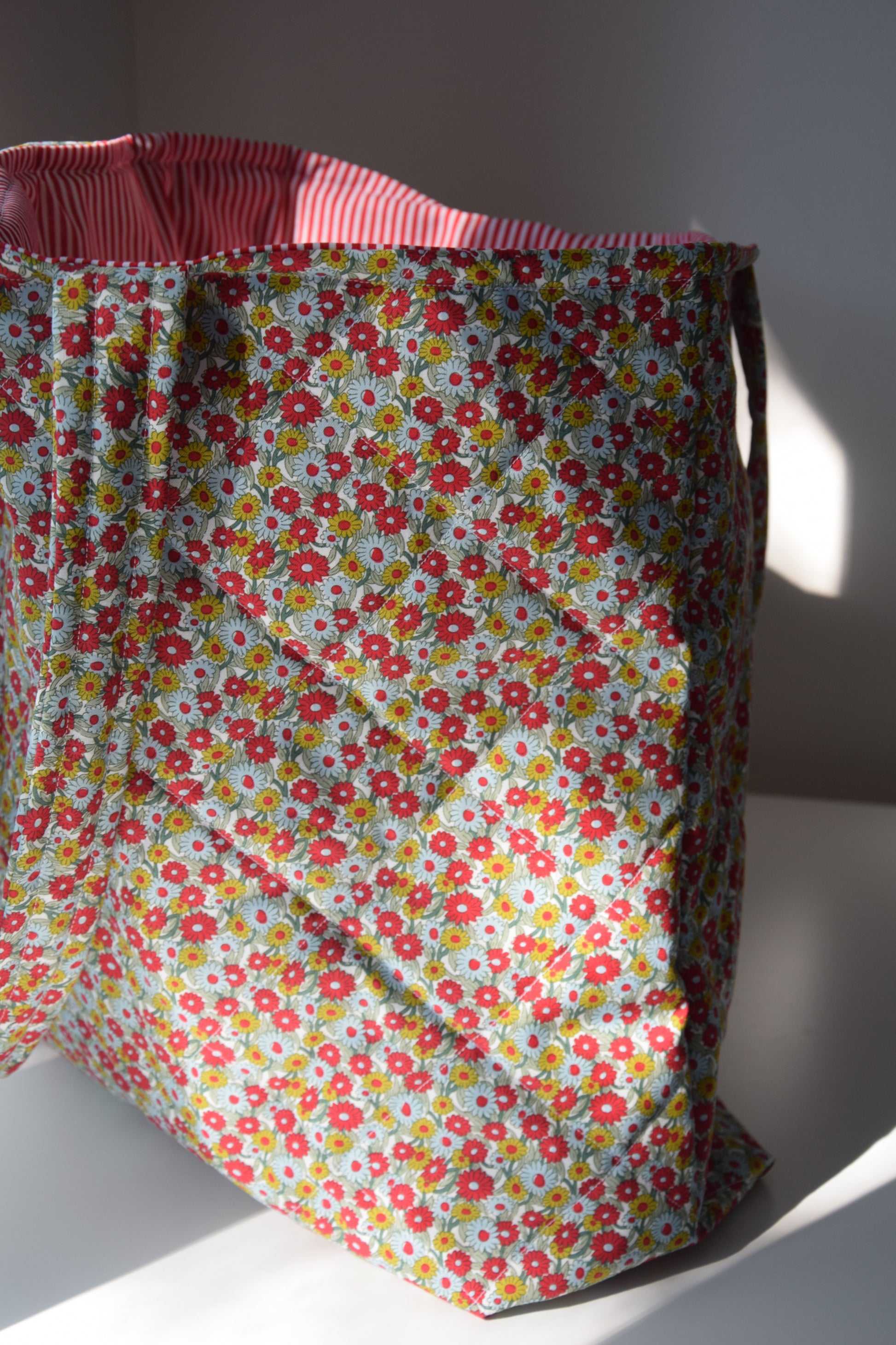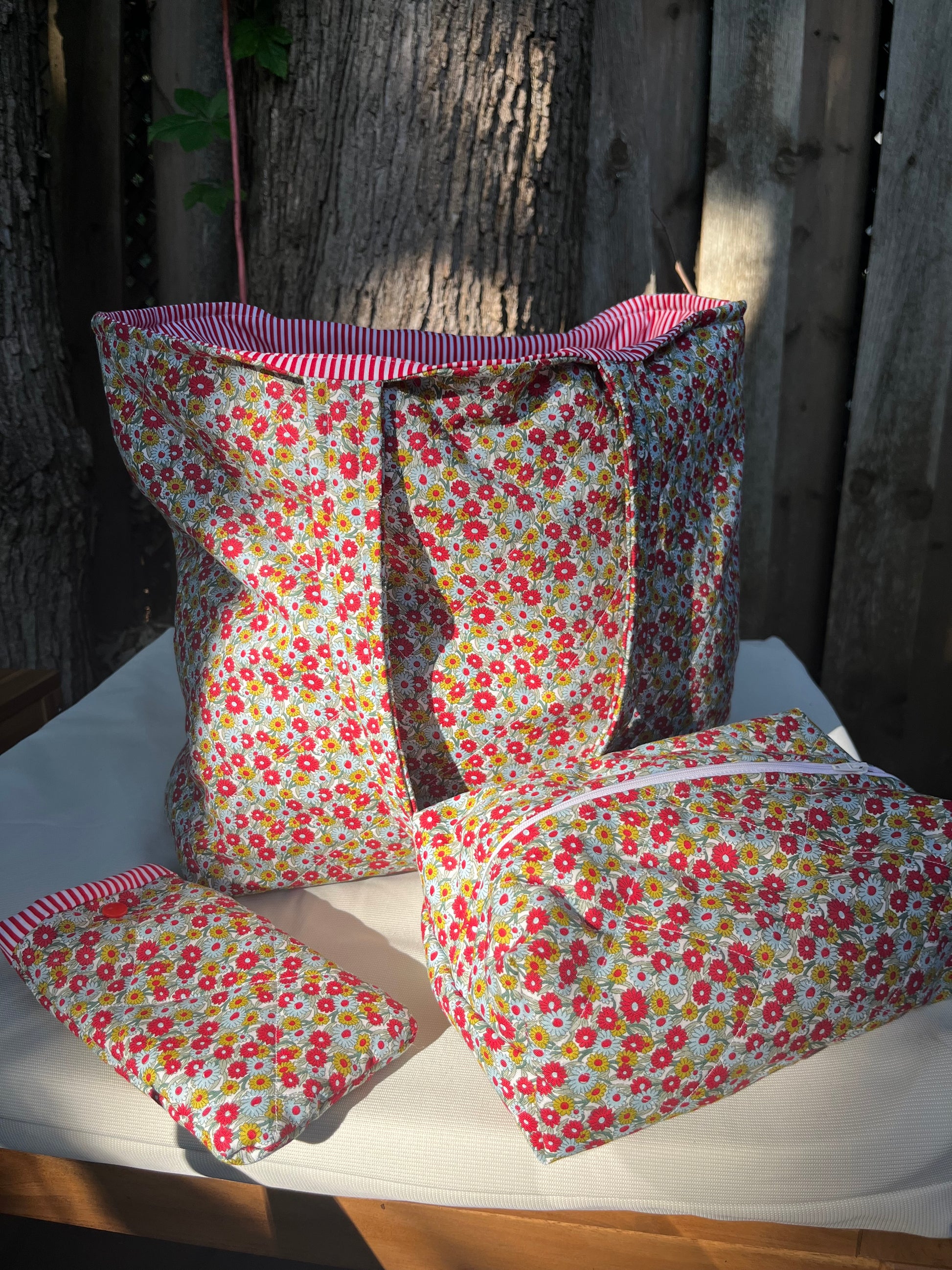 Meet your new favourite carryall. The Marguerite is a beautifully quilted tote bag made with iconic Liberty of London cotton, featuring a vibrant floral print in red, blue, and green. Lined with cheerful red stripes, this spacious bag is perfect for everyday use—whether you're heading to the market, the beach, or just out and about. Designed with flat straps for comfort and a flat bottom for easy packing, The Marguerite combines timeless charm with practical simplicity. No pockets, no fuss—just effortless style and room for everything you need.