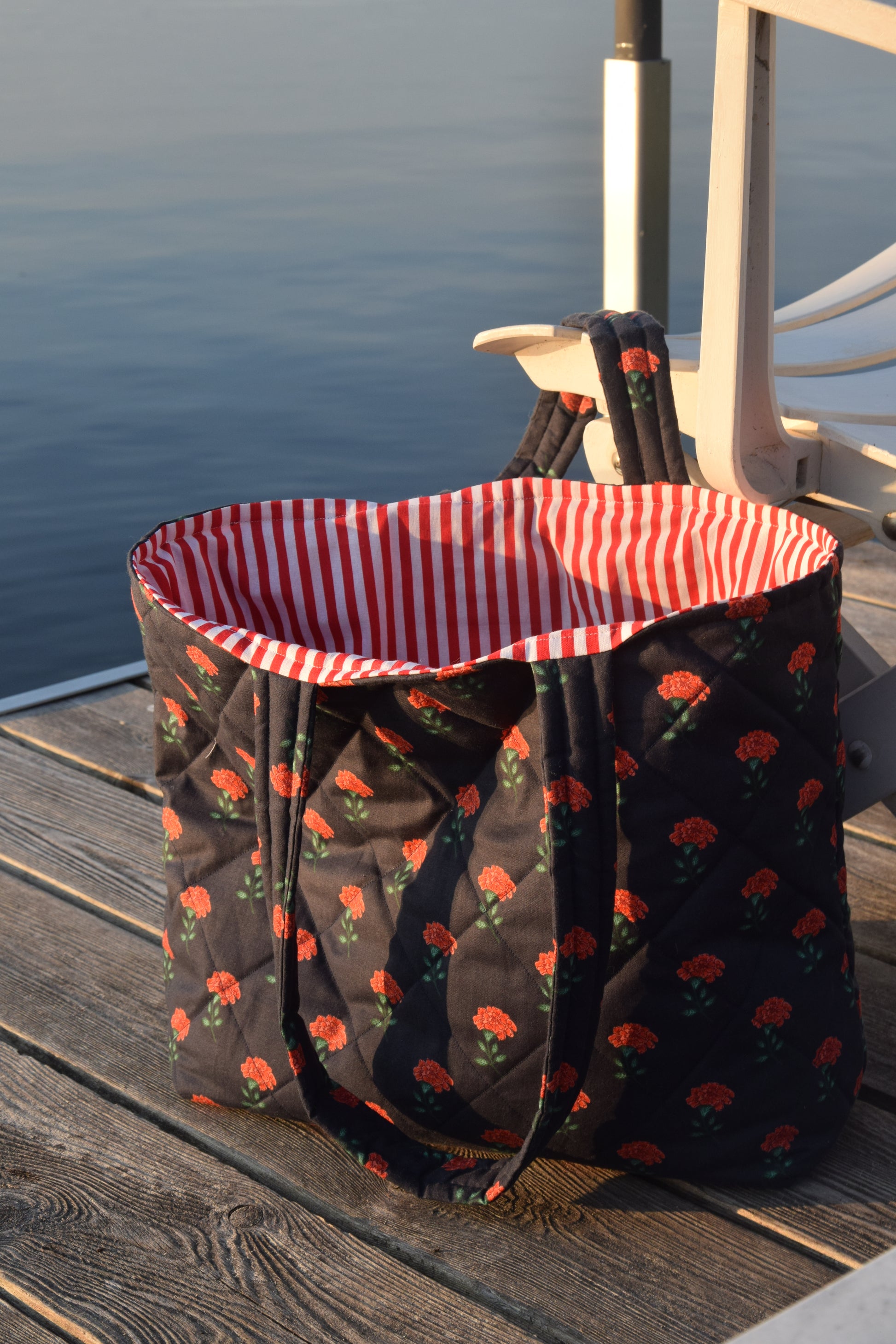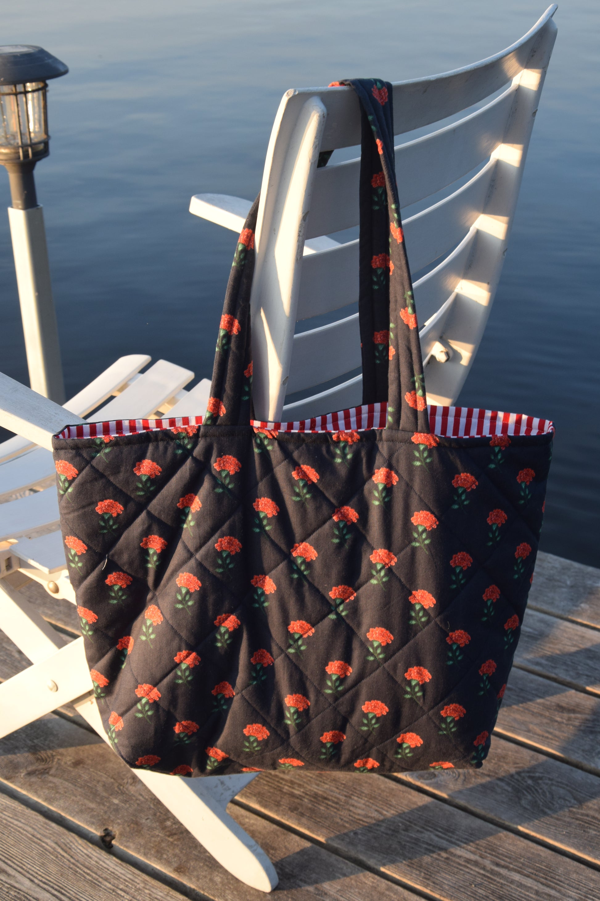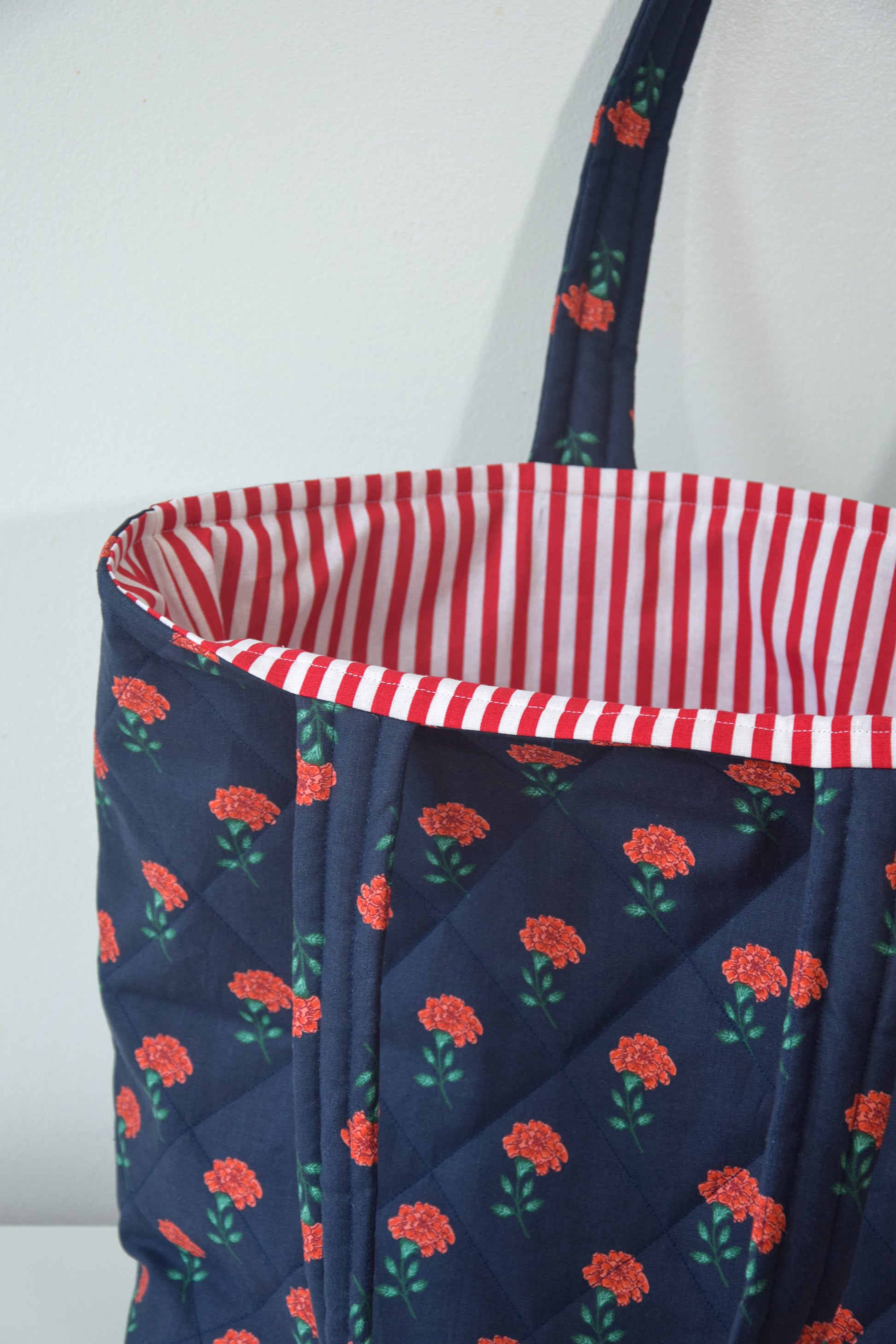 Bold and timeless, the Marisol quilted tote bag brings effortless elegance to your everyday routine. Featuring a rich navy blue exterior adorned with vibrant red florals and a striking red striped lining, this large tote is a statement in both form and function.