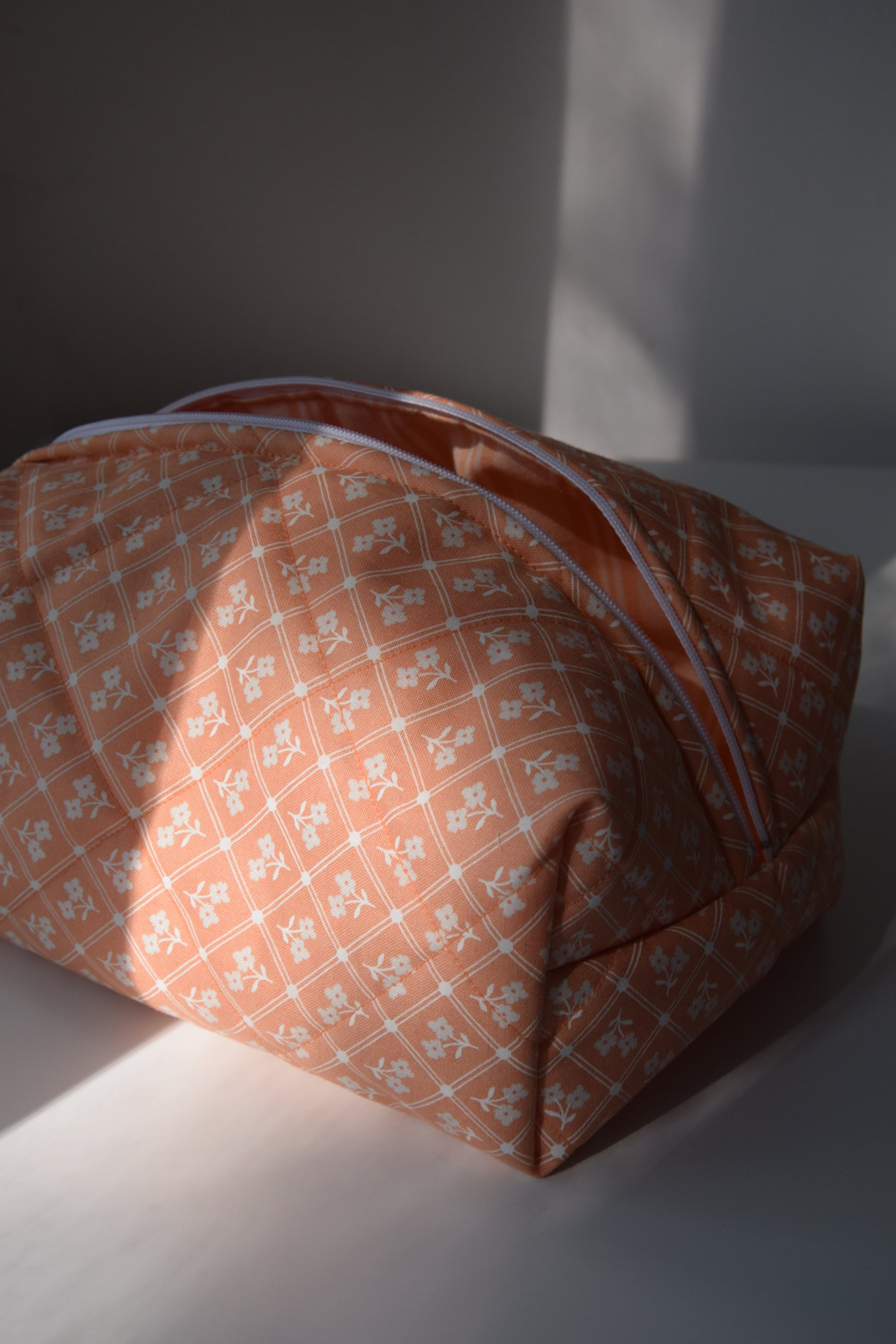 Soft, serene, and sweetly detailed — the Peach Grove Quilted Cosmetic Bag is a dreamy addition to your everyday essentials. Featuring a delicate white floral print on a warm peach background, this hand-quilted bag brings a calm, feminine charm to your routine. Inside, a cheerful pop of orange and white striped cotton lining adds a playful contrast.