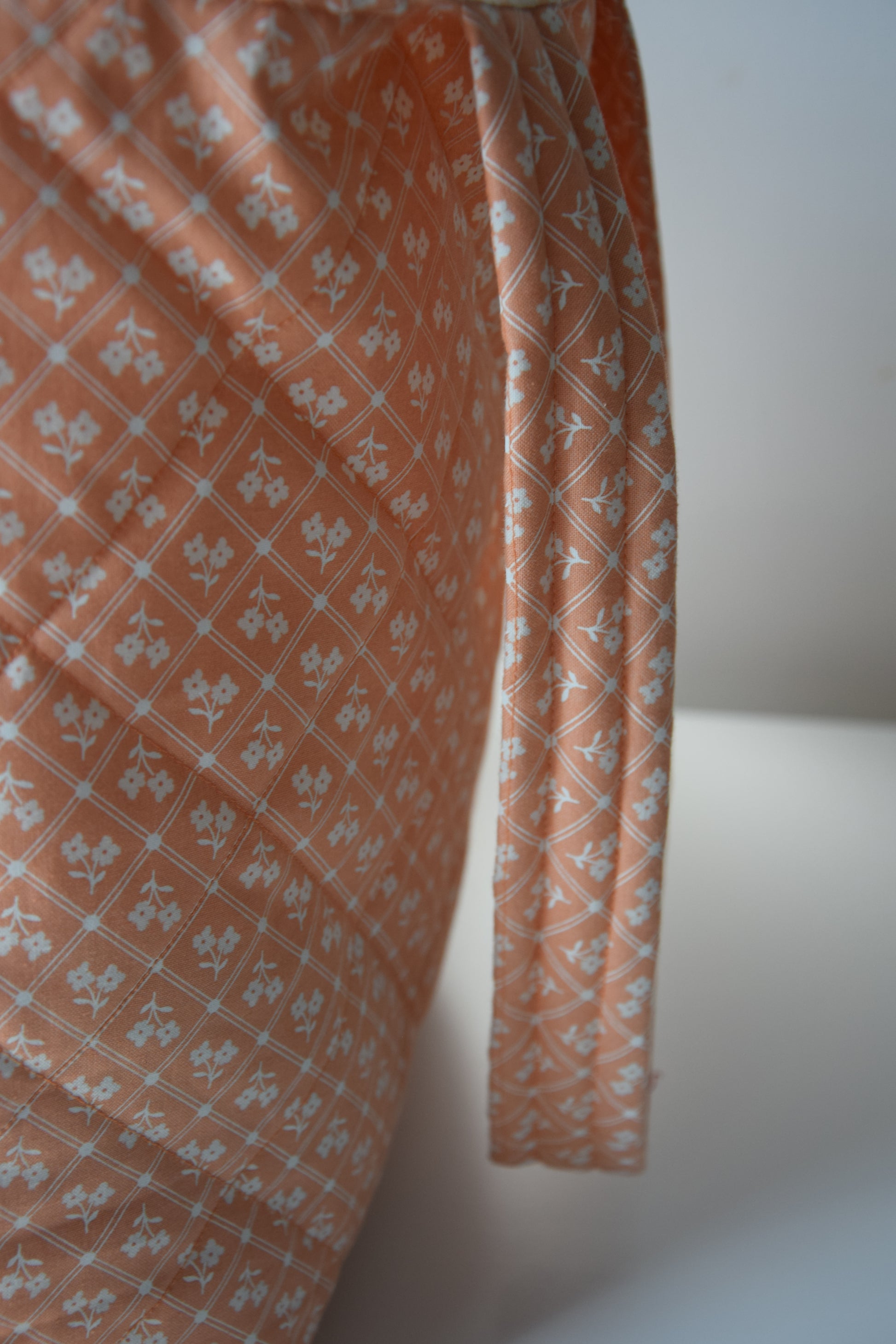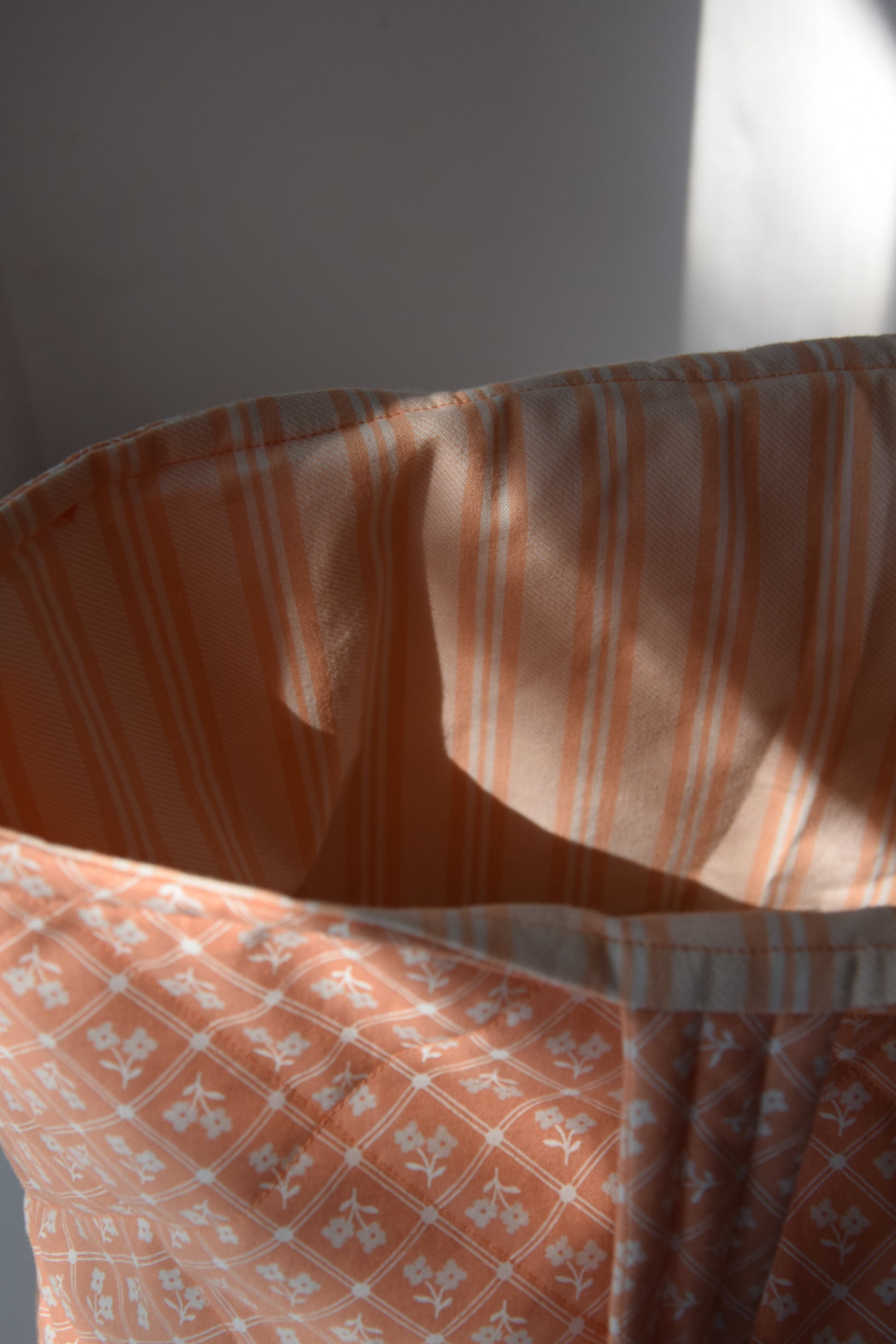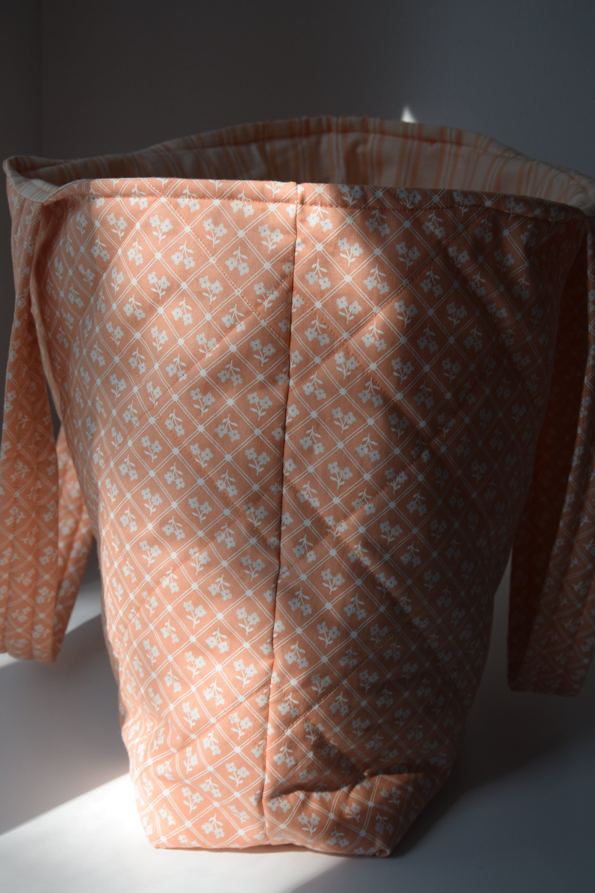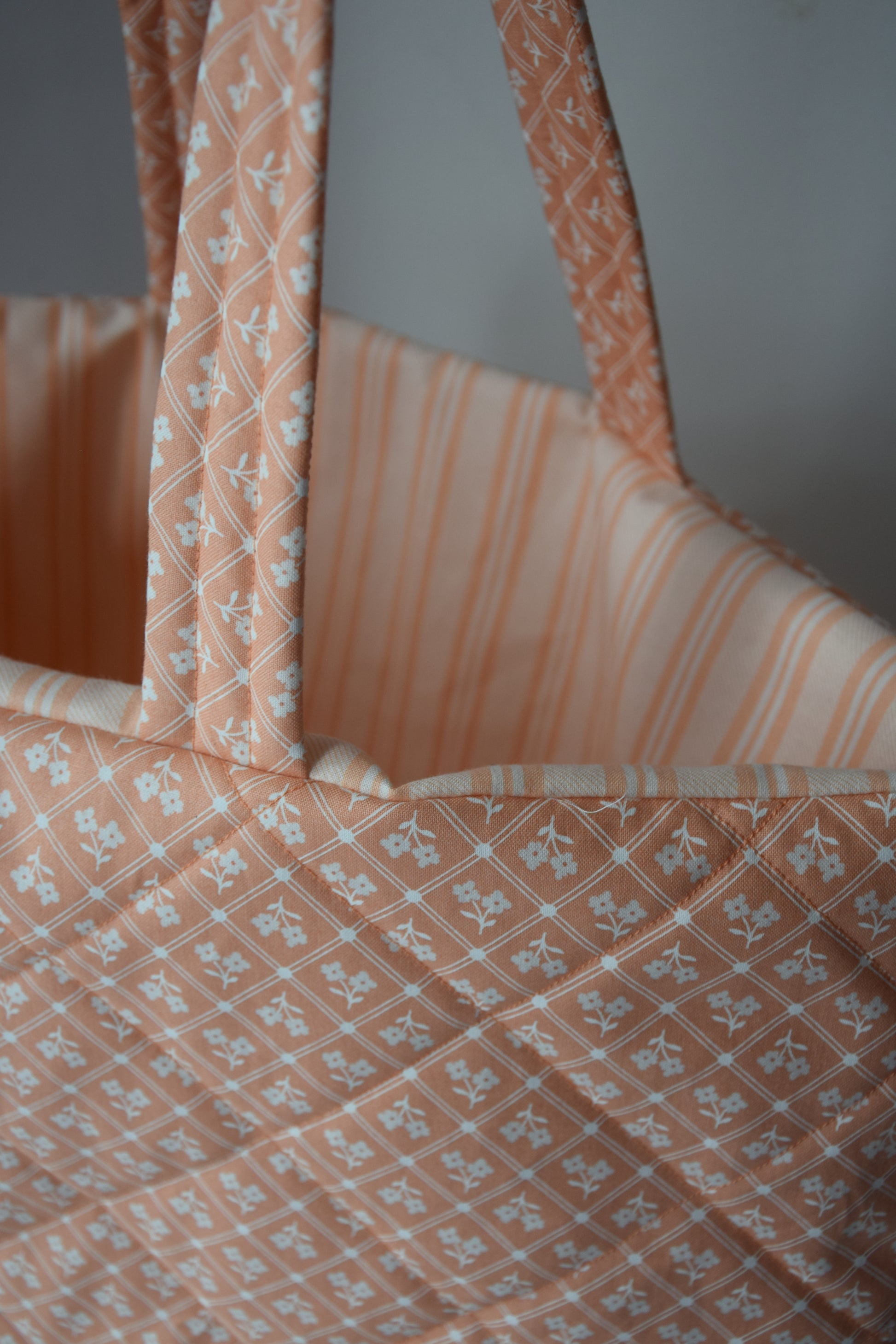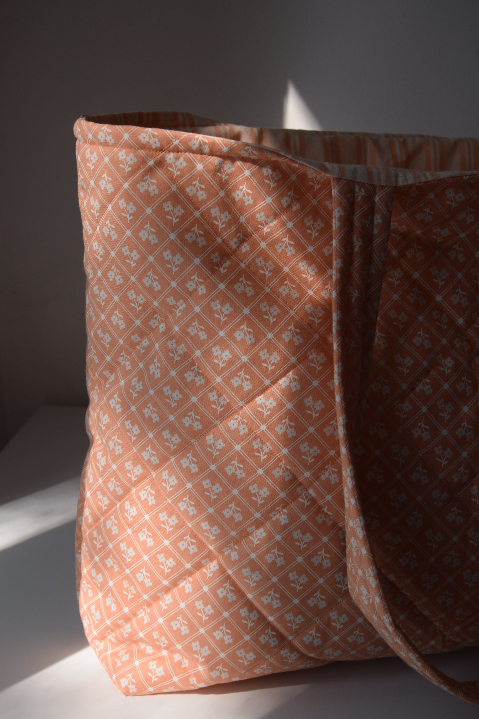 Bright, cheerful, and beautifully structured — the Peach Grove tote is your go-to for sunny strolls, farmers’ markets, or a day at the beach. Made with a soft quilted cotton in a vintage-inspired peach diamond floral print, it features a spacious interior with a flat bottom that stands on its own. The matching peach-and-white striped lining adds a charming surprise every time you open it.