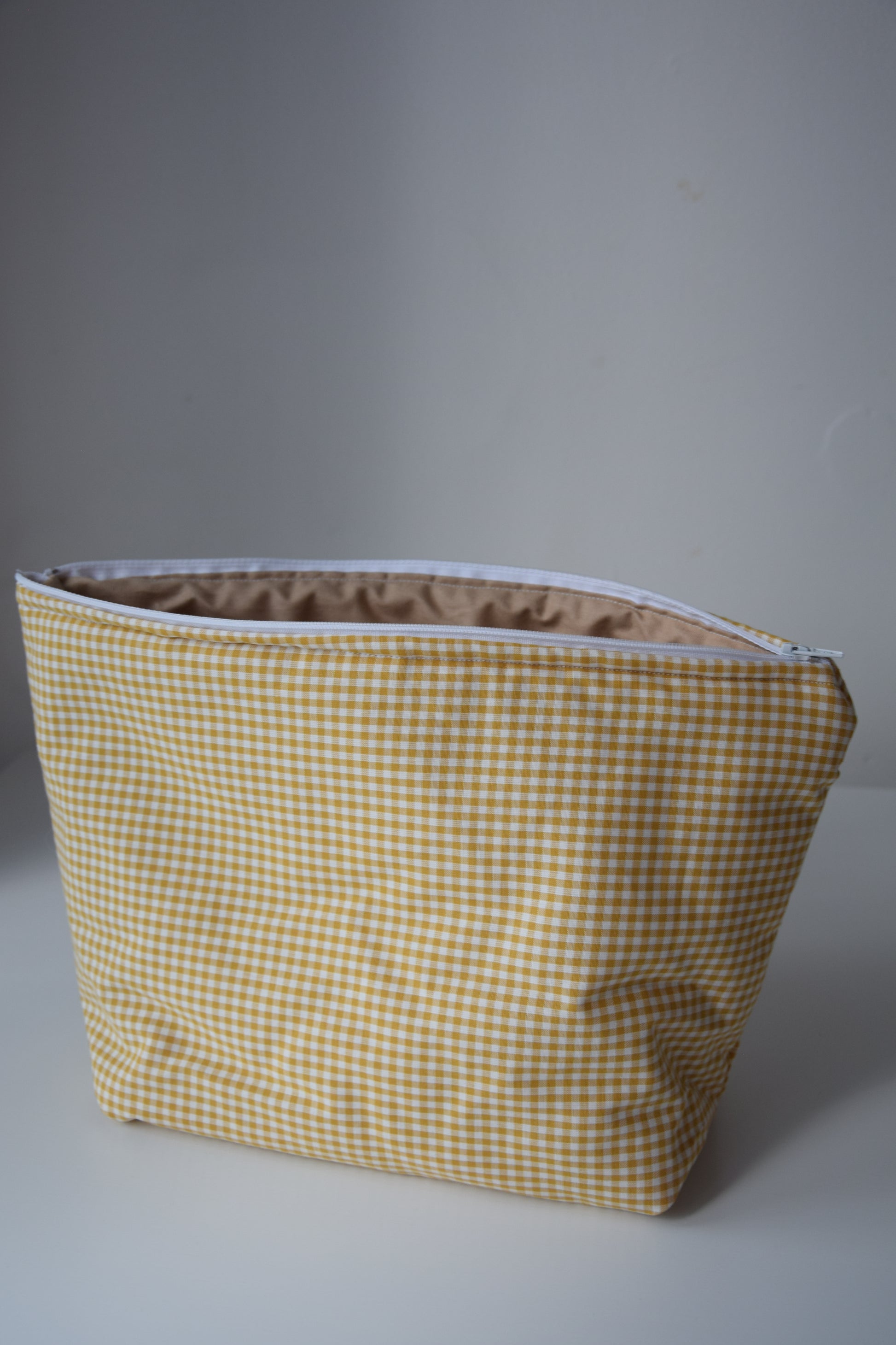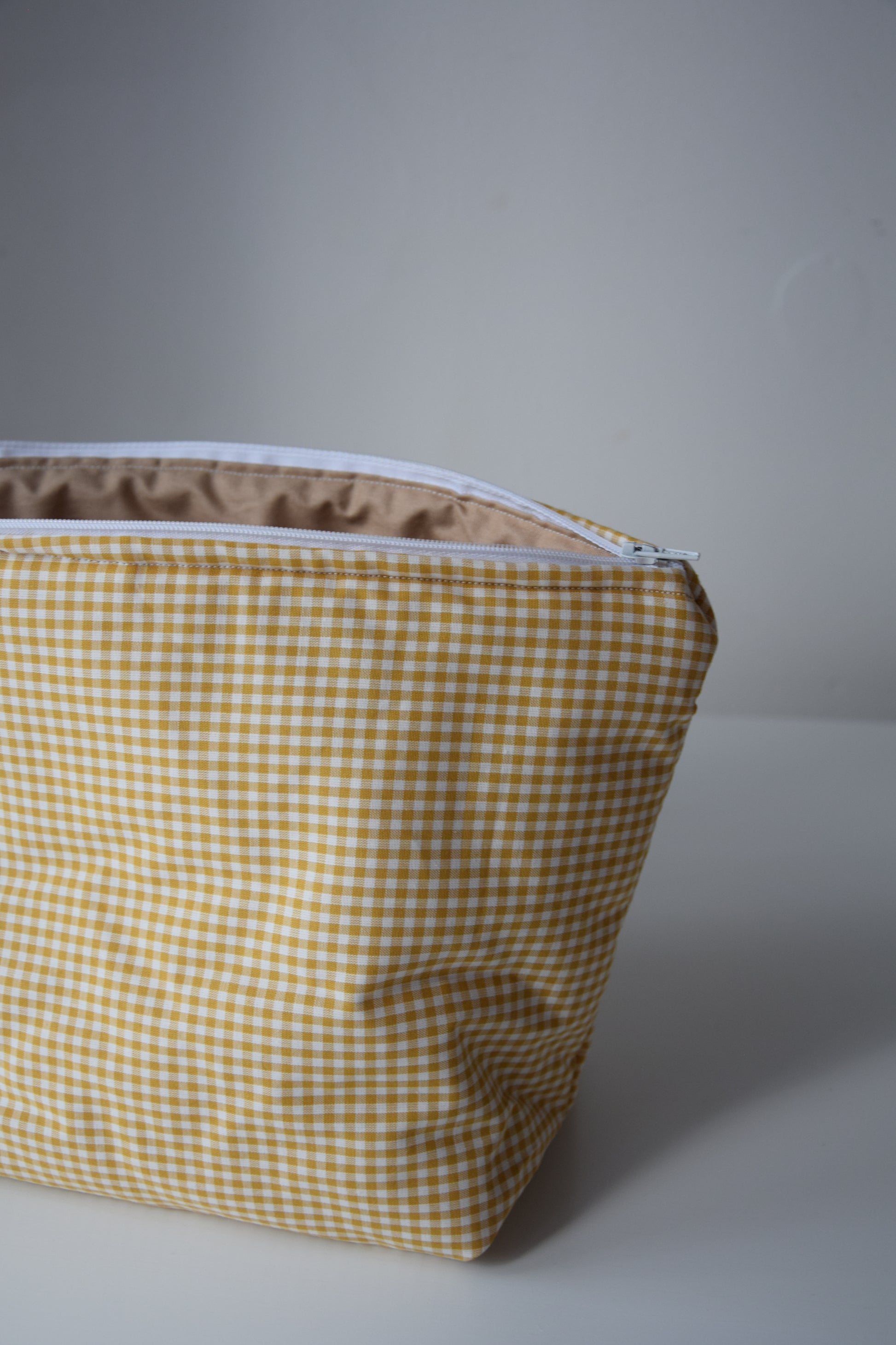 Charming and timeless, this yellow gingham cosmetic bag is as functional as it is stylish. Crafted from 100% cotton with a beige lining, it’s the perfect companion for your daily essentials or travel must-haves. The zippered closure keeps everything secure, while the spacious interior offers ample room for makeup, skincare, or toiletries. With no interior pockets, it's designed for maximum flexibility—toss in what you need and go. Simple, durable, and effortlessly cute.