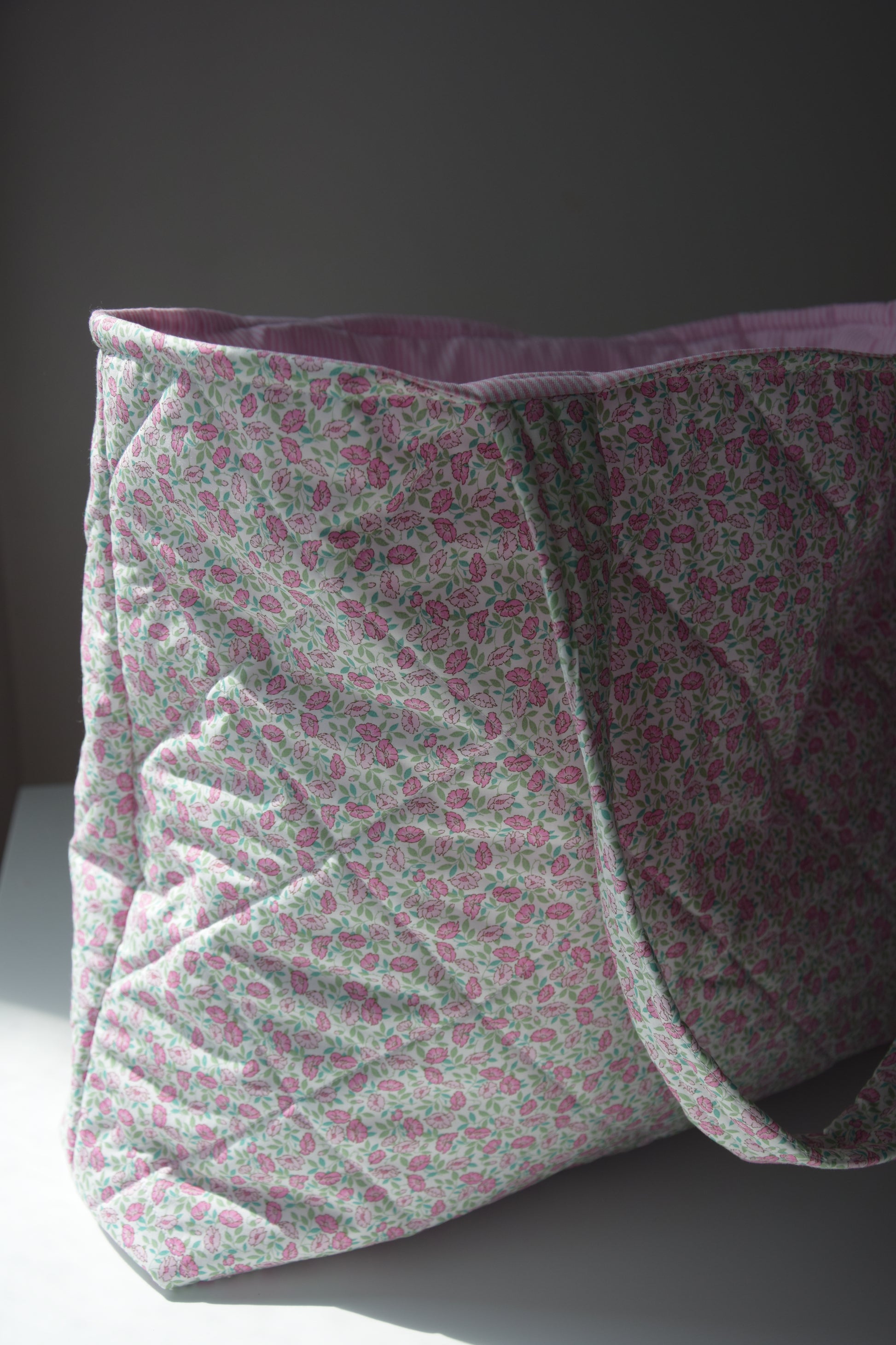 Elegant and feminine, the Viola Quilted Tote Bag features a delicate floral pattern in blush pink and leafy green on a creamy white quilted background. Lined with playful pink and white stripes, it offers a spacious, flexible interior without pockets—perfect for carrying books, a laptop, or everyday essentials. Finished with sturdy straps, Viola is as practical as it is beautiful.